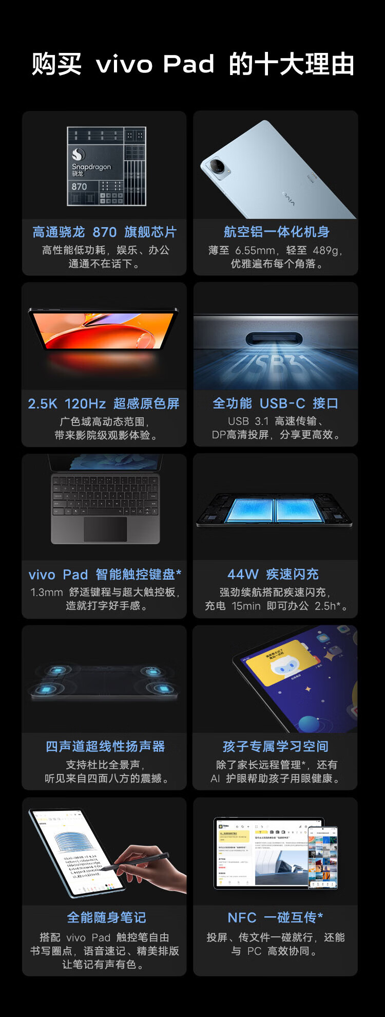商品名称:vivo Pad 平板电脑 8GB+256GB 天蓝色 高通骁龙870 航空铝一体化机身 120Hz超感原色屏 44W疾速闪充
