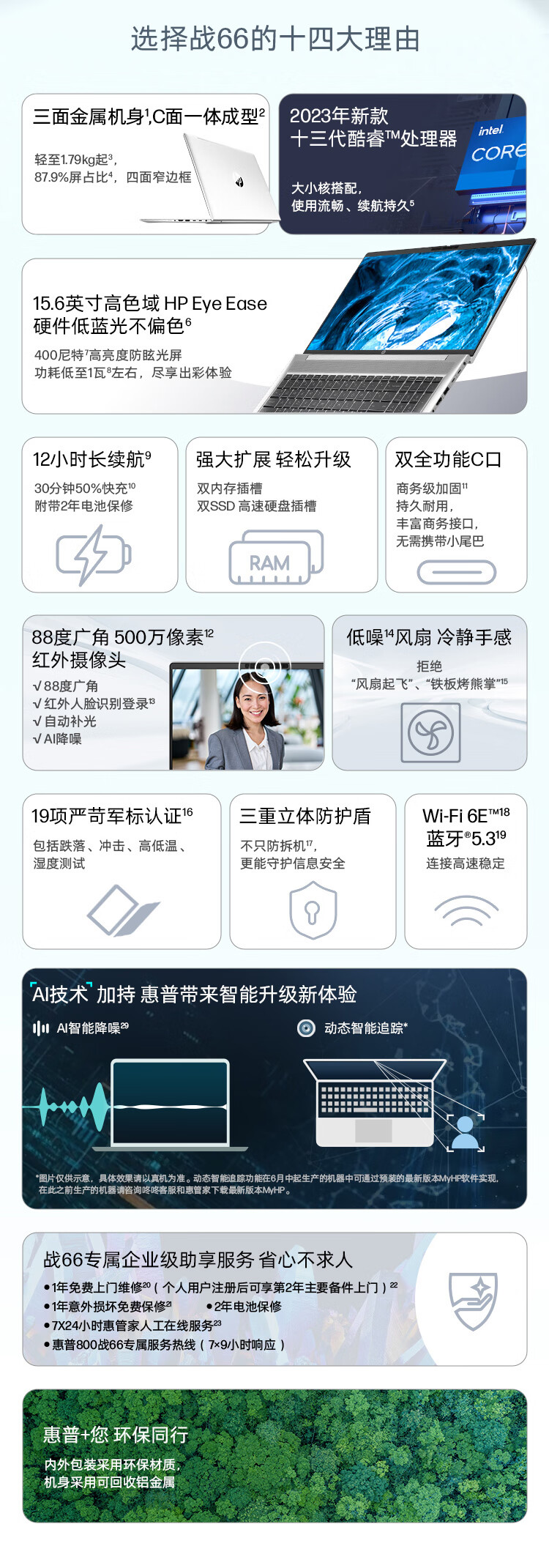 商品名称:惠普(HP)战66六代2023酷睿15.6英寸(英特尔13代i5-1340P 16G 1T 长续航 高色域低功耗 AI新体验)高性能轻薄笔记本电脑