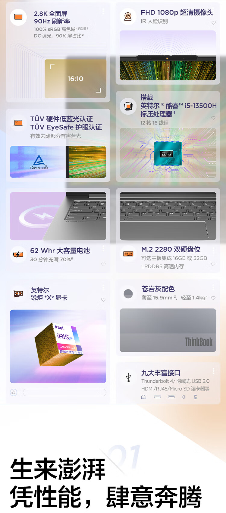 ThinkPad联想ThinkBook 14+ 英特尔Evo 14英寸标压便携轻薄办公笔记本13代i5-13500H 16G 1TB 2.8K 90Hz