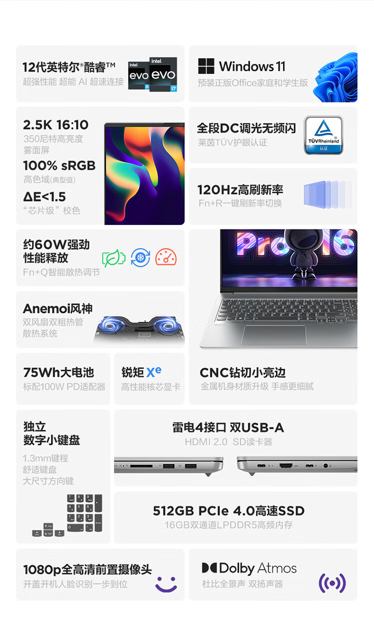 商品名称:联想笔记本电脑小新Pro16轻薄本 英特尔酷睿i5 16英寸超能本(12核标压i5 16G 512G 2.5K高刷屏)银 商务办公